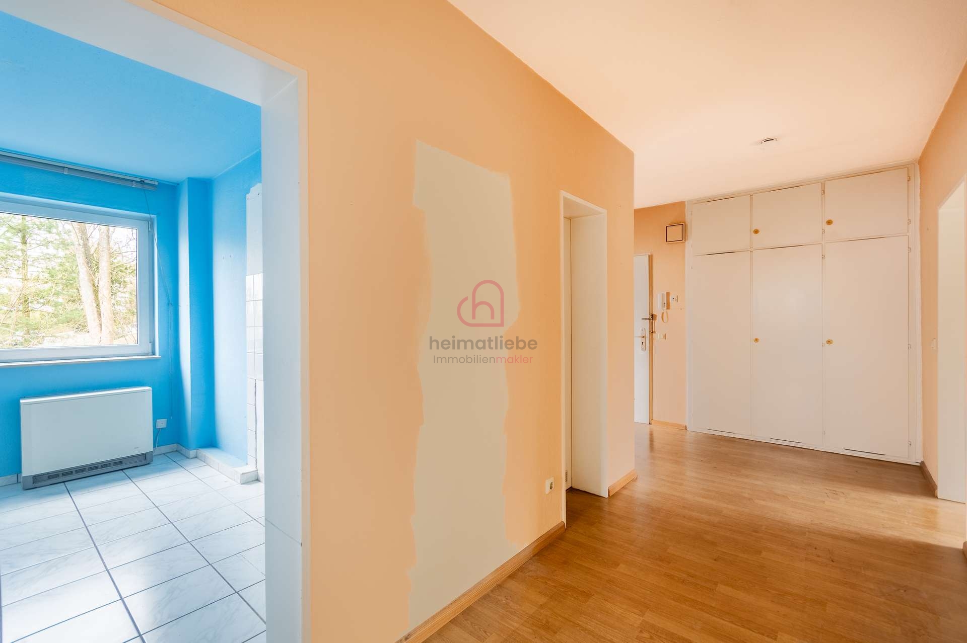 Links im Flur haben Sie Einbauschränke – praktisch um alles aus dem Blickfeld zu räumen! Dazu können Sie eine Kommode oder Garderobe installieren – auch dafür ist Platz im Flur vorhanden!